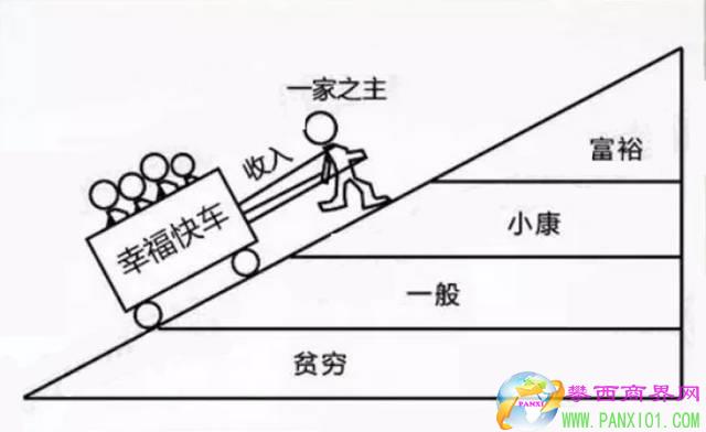 幸福的人生就像是在走上坡路。我們的生活水平一般分為四個(gè)階段:貧窮、一般、小康、富裕,每個(gè)家庭都有一輛幸??燔?,車?yán)镒覀兊母改?、配偶和孩子。每個(gè)家庭由一家之主拉著這輛車,每根繩子代表收入,收入越高,速度越快。