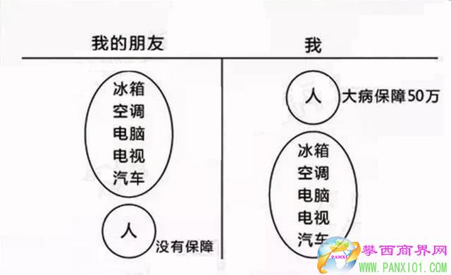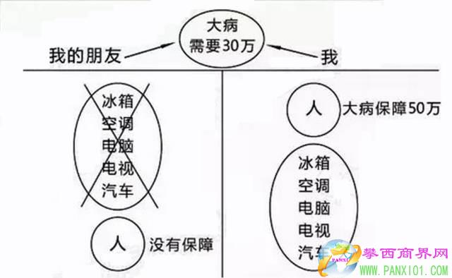 假如有一天,我和朋友都得了大病,需要30萬(wàn):我的朋友只得先賣車、再賣空調(diào)、冰箱……一場(chǎng)大病,什么都沒(méi)有了,而我有保險(xiǎn),一場(chǎng)大病賠償50萬(wàn),生活水平?jīng)]有下降,反而多了一筆錢(qián)。我們過(guò)著一樣的生活,結(jié)果為什么不同呢?
