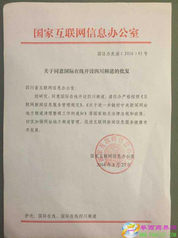 2016年8月27日,國信辦發(fā)函,國家互聯(lián)網(wǎng)信息辦公室同意國際在線開設(shè)四川頻道,標(biāo)志著又一家中央重點(diǎn)新聞網(wǎng)站——國際在線落戶四川的地方頻道——四川頻道從事互聯(lián)網(wǎng)新聞信息服務(wù)取得合法牌照。