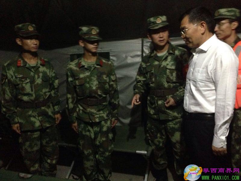2016年9月23日晚上7點(diǎn)30分,攀枝花市市長來到仁和區(qū)大田鎮(zhèn)214省道被山洪沖毀的搶險(xiǎn)點(diǎn),看望正在連夜加班加點(diǎn)作業(yè)的武警水電第九支隊(duì)官兵,詢問災(zāi)情和道路修復(fù)進(jìn)度情況。8點(diǎn)10分,來到了武警水電第九支隊(duì)宿營地看望慰問營地?fù)Q班休整的官兵??吹轿渚姽俦≡趲づ窭镉H切的問:"有沒有地方洗澡?",九支隊(duì)后勤處副處長趙云回答:"我們自己帶有凈水車和淋浴車,能夠滿足官兵的洗浴要求"。后勤處副處長趙云和一大隊(duì)教導(dǎo)員唐義夫還就搶險(xiǎn)任務(wù)、完成情況、后勤保障等一一做了介紹。