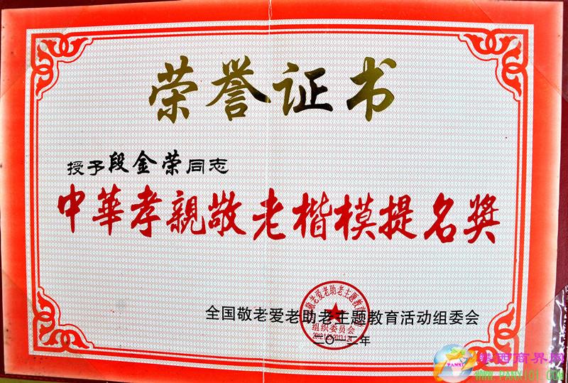 在“會理金尚養(yǎng)老公寓”大門右側(cè)的榮譽(yù)墻上,段金榮被四川省敬老愛老助老主題教育活動組委會授予“四川省十大孝親敬老楷模”;被全國敬老愛老助老主題教育活動組委會授予“中華孝親敬老楷模提名獎”,據(jù)悉,該項(xiàng)評比活動每五年舉辦一屆,(每屆表彰50名)面對榮譽(yù),段金榮顯得很淡然,他說:“榮譽(yù)是社會對我養(yǎng)老事業(yè)的肯定,更是一種鞭策,爭取在明年取得“全國敬老愛老助老主題教育活動敬老教育模范”榮譽(yù)稱號,在人民大會堂分享敬老愛老助老經(jīng)驗(yàn),以綿薄之力傳承中國的孝道文化,讓更多的養(yǎng)老人過上更加幸福的晚年生活。