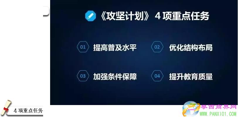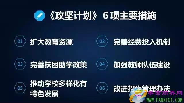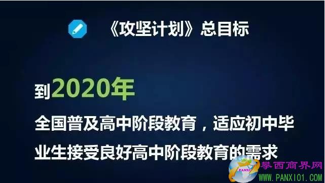 重點是提高教育基礎(chǔ)薄弱特別是高中階段教育毛入學率較低地區(qū)的普及程度,提高特殊群體接受高中階段教育的機會,解決有學上的問題。