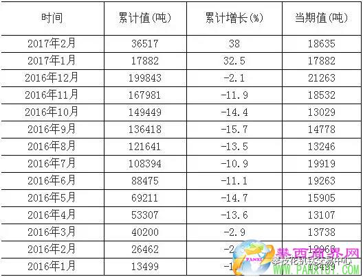 據(jù)數(shù)據(jù)庫數(shù)據(jù)顯示,2017年1-2月我國鈦白粉進口量累計36517噸,同比增長38%,其中2月進口量為18635噸。