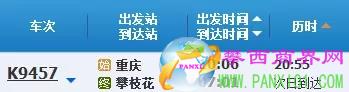 K9457次重慶至攀枝花列車出發(fā)時(shí)間是10:06,到達(dá)攀枝花時(shí)間為次日7:01。