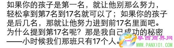 我發(fā)現(xiàn)大陸家長很在意成績,都想讓孩子考第一名。其實,現(xiàn)在世界精英都不是當(dāng)年的尖子生,他們在班級的排名是第7名到第17名。原因就是這些孩子人際關(guān)系更好,可以和第一名做朋友,也可以和最后一名做朋友,而且孩子壓力小,生活更輕松,創(chuàng)意最好。