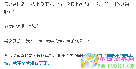臺(tái)灣著名作家吳念真曾經(jīng)講述過(guò)這樣的事情。他的兒子數(shù)學(xué)成績(jī)很爛,老師在和家長(zhǎng)的聯(lián)絡(luò)簿上寫道:“數(shù)學(xué)成績(jī)要加強(qiáng)!”