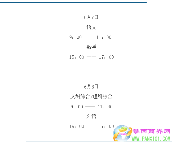 根據(jù)《教育部關(guān)于做好2017年普通高校招生工作的通知》(教學(xué)〔2017〕1號)有關(guān)要求,2017年普通高等學(xué)校招生全國統(tǒng)一考試全國統(tǒng)考科目的考試時間安排為:
