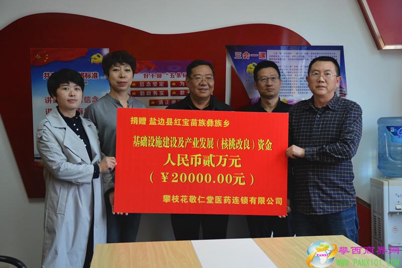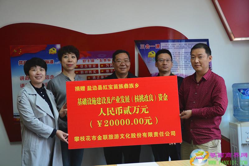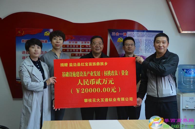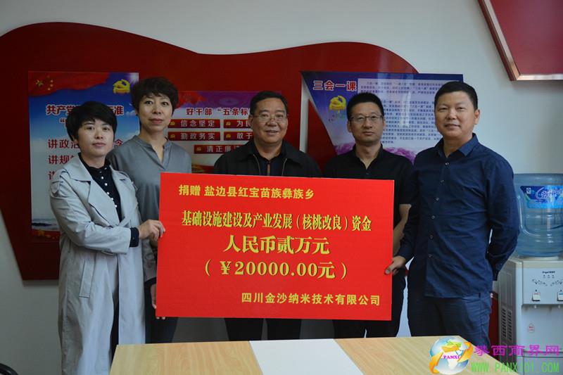 在中共攀枝花市委統(tǒng)戰(zhàn)部副部長、市工商聯(lián)黨組書記、常務(wù)副主席陳繼川、市民政局黨組成員、機關(guān)黨委書記王川江、鹽邊縣政協(xié)副主席、縣工商聯(lián)主席陳穎等領(lǐng)導(dǎo)共同見證下,四川金沙納米技術(shù)有限公司、攀枝花市金聯(lián)旅游文化開發(fā)股份有限公司、攀枝花敬仁堂醫(yī)藥連鎖有限公司和攀枝花大互通鈦業(yè)有限公司等4家企業(yè)通過攀枝花市慈善會,分別向鹽邊縣紅寶苗族彝族鄉(xiāng)進行現(xiàn)場捐贈,4家企業(yè)各捐贈現(xiàn)金2萬元。