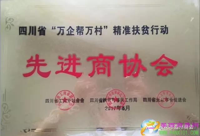 2017年5月,攀枝花市溫州商會在四川省“萬企幫萬村”精準扶貧工作中率先垂范、成績突出,被四川省工商聯(lián)、四川省扶貧和移民工作局、四川省光彩事業(yè)促進會評為“萬企幫萬村”精準扶貧行動“先進商協(xié)會”。 在參加此次評選的攀枝花市商協(xié)會中,攀枝花市溫州商會為唯一一家受到表彰的商協(xié)會。