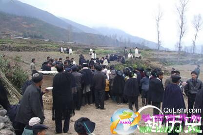 在槍聲陪伴下主方抬起砣砣肉和蕎餅,讓客人自由組合成團(tuán),不分男女老幼,不管相識或相關(guān)與否,按人頭分給一份砣砣肉、蕎餅或米飯。待到在場的人都得到一份時,主人鳴槍,大聲宣布喪事圓滿結(jié)束,并勸各路賓客回到村寨吃點(diǎn)便餐再走。至此,有宴者可以赴宴,無宴者可以歸家,整個喪葬儀式便告完成。
