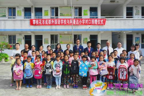 攀枝花市成都外國(guó)語學(xué)校此次為阿署達(dá)小學(xué)的38名學(xué)生每人捐贈(zèng)了一套價(jià)值百元的學(xué)習(xí)用品(書包、文具盒等),并且還向?qū)W校贈(zèng)送了200多本孩子們喜聞樂見的少兒讀物。所有捐贈(zèng)物品均由攀枝花市成都外國(guó)語學(xué)校的學(xué)生代表進(jìn)行發(fā)放,寓意愛的傳承。