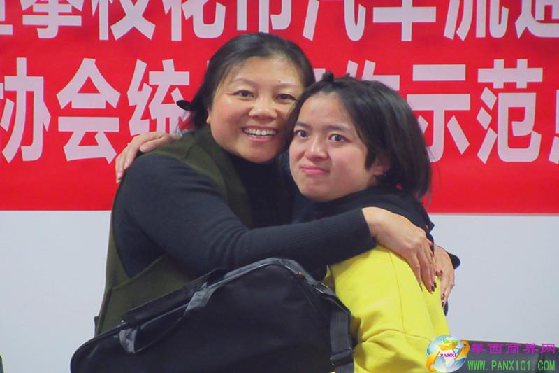 攀彬抱著筆記本電腦含著感恩的淚水與譚曉紅副會長緊緊相擁 孩子們快樂起舞