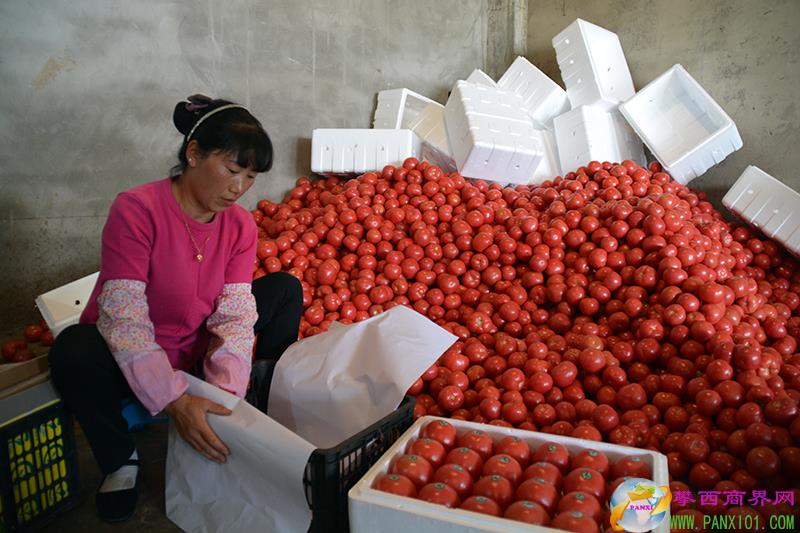在攀西農產品交易市場內,來往運輸番茄的農用車輛和往外運輸?shù)目ㄜ嚱j繹不絕,收購農產品的攤點上,選果、裝箱的工人也是忙碌不停。