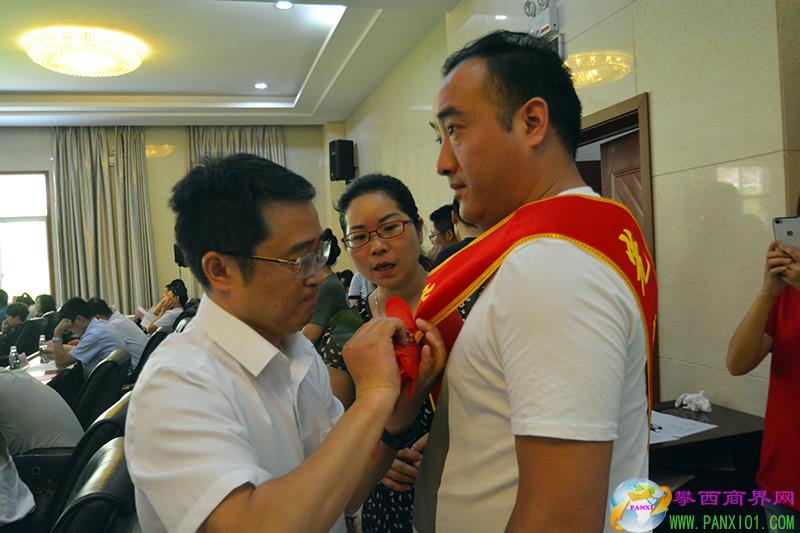 攀枝花市仁和區(qū)工商聯(lián)黨組書記、常務副主席王坤全同志(左一)為獲獎民企佩戴綬帶。