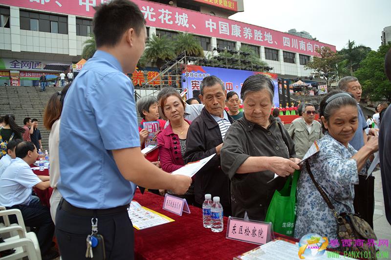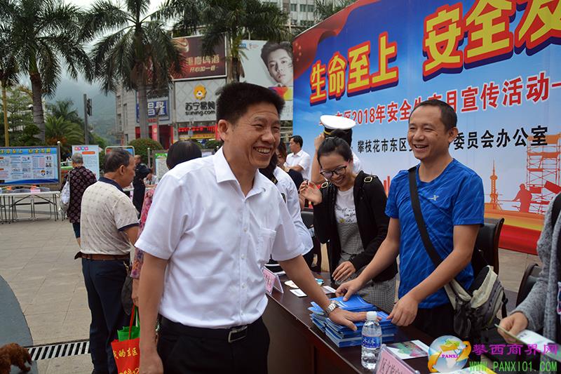 中共攀枝花市東區(qū)委員會常委、區(qū)委政法委員會書記高應(yīng)華(中)來到展臺前查看宣傳資料。