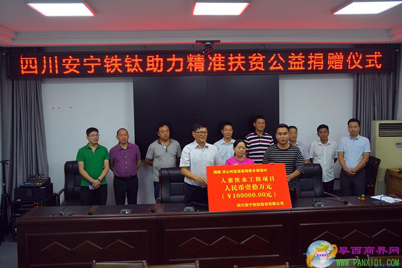 攀西商界網(wǎng)報(bào)道(陳忠榮 文 熊毅 敬輝 圖) 7月17日,攀枝花市工商聯(lián)、市扶貧移民局和市委組織部(市援藏辦)組織愛心企業(yè)開展助力精準(zhǔn)扶貧公益捐贈(zèng),四川省工商聯(lián)(商會(huì))副會(huì)長單位、四川安寧鐵鈦股份有限公司通過四川省扶貧基金會(huì)攀枝花分會(huì)向結(jié)對(duì)幫扶的涼山州木里縣、鹽源縣和攀枝花市鹽邊縣的四個(gè)貧困村捐款51萬元。