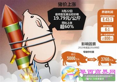 根據(jù)農(nóng)業(yè)部公布的數(shù)據(jù),2015年3月31日,全國生豬出欄均價為11.6元/公斤,一年的時間,同比劇增70%。上周(3月28日-4月3日)全國36個大中城市豬肉平均批發(fā)價格為每公斤25.34元,比前一周上漲0.4%創(chuàng)下2011年10月末以來新高.