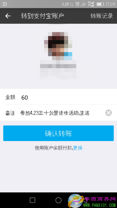輸入金額:60元整;備注:參加4.23三十公里徒步活動(dòng),(自己的真實(shí)姓名)