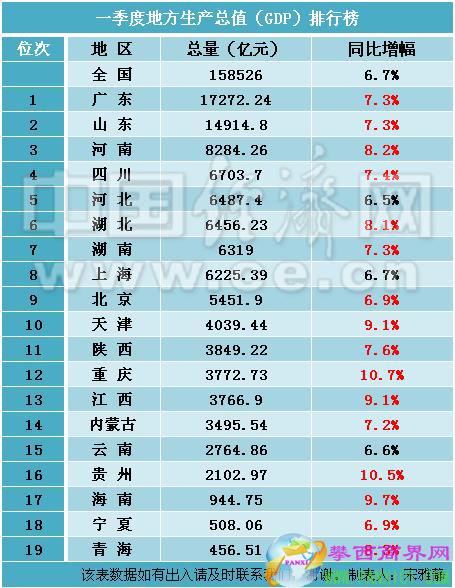 從中國(guó)經(jīng)濟(jì)網(wǎng)記者制作的一季度地方生產(chǎn)總值(GDP)排行榜中可以看出,目前榜單總量前三名的是廣東、山東、河南,其中廣東GDP總量17272.24億元穩(wěn)居全國(guó)第一,山東GDP總量14914.8億元暫居第二,河南GDP總量8284.26億元暫居第三。