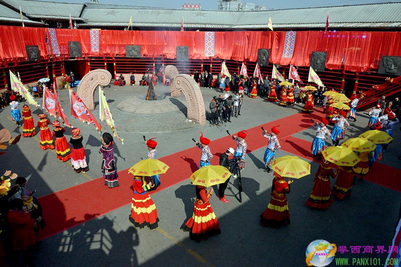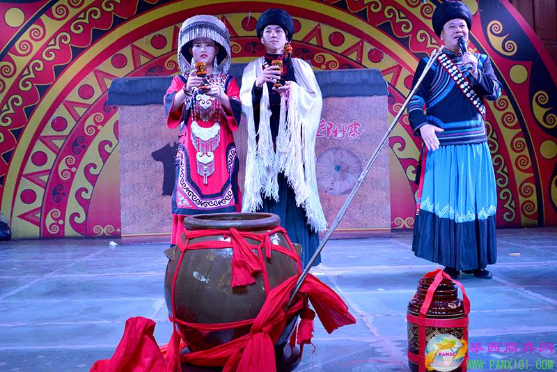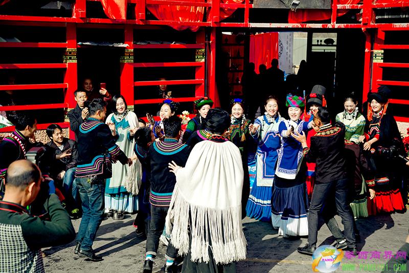 整個(gè)正面從舞臺到周邊布局氣勢宏大,彝族文化元素濃郁,參與演員80多人,彝族服裝陣容整齊,300多圍觀人群,頗有一場大型戶外情景劇的陣容。