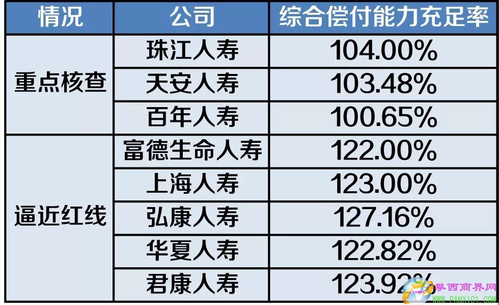 除不達標險企外,2018年第四季度有3家險企被列為重點核查對象,分別是珠江人壽、天安人壽和百年人壽,其綜合償付能力充足率分別為104%、103.48%和100.65%。此外,有5家人身險公司的綜合償付能力充足率逼近重點核查紅線,分別為富德生命人壽、上海人壽、弘康人壽、華夏人壽和君康人壽,其綜合償付能力充足率分別為122%、123%、127.16%、122.82%和123.92%。