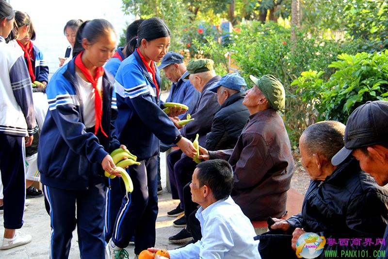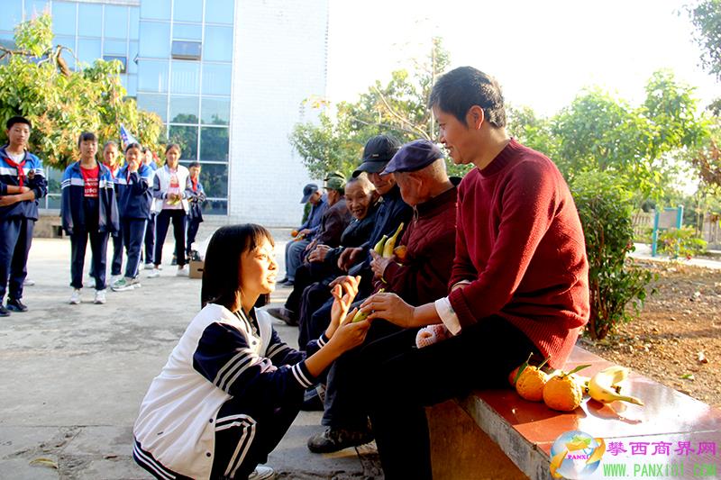 三月的米易,鮮花盛開(kāi),瓜果飄香??h社會(huì)福利院一位位孤寡老人悠閑的坐在花崗石條凳上,有的在聊天、有的在望著遠(yuǎn)方、有的在修指甲。米易民中學(xué)生佩戴著團(tuán)徽、紅領(lǐng)巾,扛著紅色的校旗、團(tuán)旗、隊(duì)旗走進(jìn)敬老院。把買(mǎi)來(lái)的香蕉、椪柑、蘋(píng)果、草莓等水果分發(fā)給老人。