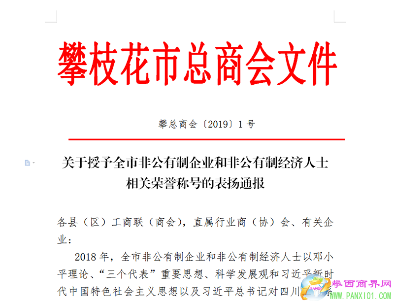 為總結經(jīng)驗,鼓勵先進,樹立典型,營造全社會關心支持非公有制經(jīng)濟發(fā)展的良好氛圍,市工商聯(lián)(總商會)按照《攀枝花市非公有制經(jīng)濟榮譽申報辦法(2018)》,本著公開、公正、平等的原則,經(jīng)企業(yè)自主申報并征求相關部門意見,決定授予:張璽等21人為“2018年度攀枝花市優(yōu)秀民營企業(yè)家”、卜凡等13人為 “2018年度攀枝花市優(yōu)秀職業(yè)經(jīng)理人”、 四川安寧鐵鈦股份有限公司等30戶企業(yè)為“2018年度攀枝花市誠信企業(yè)” 、四川龍蟒礦冶有限責任公司等10戶企業(yè)為“2018年度‘萬企幫萬村’/‘千企幫千村’精準扶貧行動先進單位”、 攀枝花市綠色建材發(fā)展協(xié)會等23戶企業(yè)(商/協(xié)會)為“2018年度攀枝花市光彩事業(yè)先進單位”(具體名單附后)。