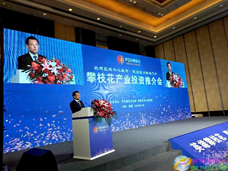 攀枝花市委書(shū)記賈瑞云致歡迎辭。市委副書(shū)記、市長(zhǎng)王波主持投資推介會(huì)。