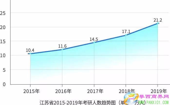 江蘇一直是考研大省,從2015年的10.4萬人到2019年的21.2萬人,5年間,考研人數(shù)翻了一番還多。