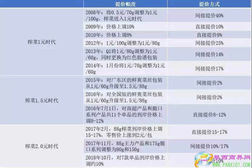 根據(jù)長城證券研究所的分析報告,涪陵榨菜先后經(jīng)歷了三個價格時代。提價手段主要有兩種:一是直接提高出廠價、零售價;二是通過包裝升級、調(diào)整規(guī)格進(jìn)行間接提價。