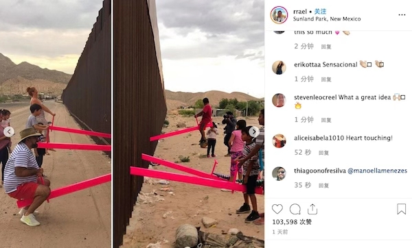 據(jù)英國(guó)《衛(wèi)報(bào)》報(bào)道,該裝置的設(shè)計(jì)者Ronald Rael和Virginia San Fratello 是加州大學(xué)建筑和設(shè)計(jì)學(xué)的教授。他們?yōu)榇隧?xiàng)目繪制第一幅設(shè)計(jì)圖可以追溯到2009年,但直到前不久才付諸實(shí)施。夫婦倆來到德克薩斯州埃爾帕索市郊,這里的美墨邊境線上樹立著鋼架結(jié)構(gòu)的高墻,他們將做好的熒光粉色蹺蹺板架設(shè)在這些鋼鐵柵欄上。據(jù)意大利《共和報(bào)》報(bào)道,當(dāng)?shù)厝藢?duì)他們的行動(dòng)預(yù)先并不知情,但孩子們很快就聚集到墻兩邊玩耍起來。Ronald Rael在自己的Instagram上分享了現(xiàn)場(chǎng)的照片和短視頻,可以看出兩邊都有不少大人小孩來乘坐這些蹺蹺板。這篇發(fā)文很快獲得了超過10萬人點(diǎn)贊,作者在圖片附言中寫道:“隔離墻已成為美墨關(guān)系的樞紐(蹺蹺板中間的轉(zhuǎn)軸)。雙方兒童和成人因此變得休戚相關(guān),大家都意識(shí)到,一方采取任何行動(dòng),都會(huì)對(duì)另一方產(chǎn)生直接的后果。”