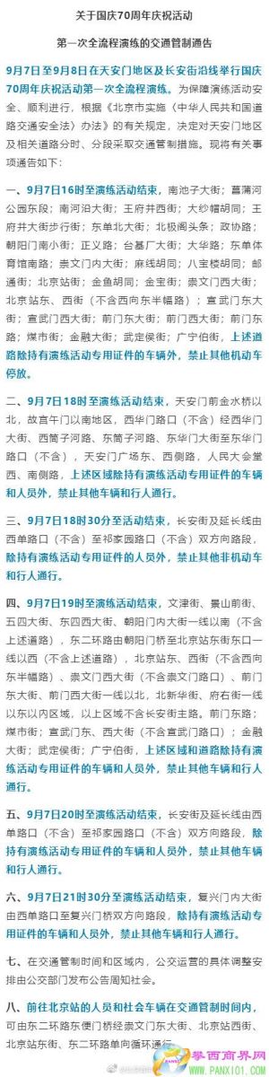 (原題為《國(guó)慶70周年慶?;顒?dòng)第一次全流程演練!9月7日至8日,北京這些地方交通管制》)