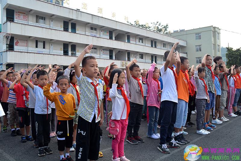 大龍?zhí)多l(xiāng)中心學(xué)校書記、校長(zhǎng)倪林興(前排右一)致歡迎辭并向捐贈(zèng)單位贈(zèng)送錦旗。