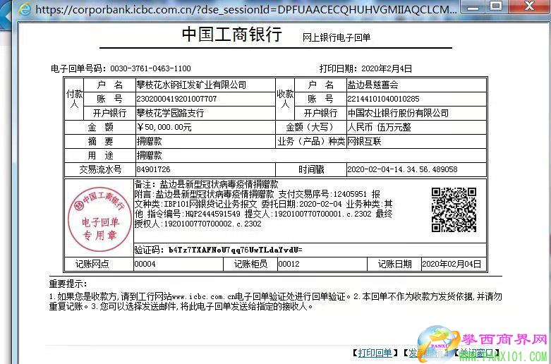 鹽邊縣宏緣礦業(yè)有限責(zé)任公司向鹽邊縣慈善會(huì)捐贈(zèng)善款。