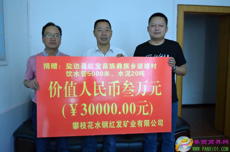 攀西商界網(wǎng)報道(記者 熊毅)5月15日,攀枝花市工商聯(lián)在五樓會議室舉行捐贈儀式,攀枝花水鋼紅發(fā)礦業(yè)有限公司通過四川省扶貧基金會攀枝花市分會向鹽邊縣紅寶苗族彝族鄉(xiāng)謎塘村人畜飲水項目定向捐贈工程物資,包括直徑2.5寸飲水膠管5000米、水泥20噸,價值人民幣叁萬元,主要用于該村農(nóng)戶引水管道、蓄水池、生產(chǎn)用水溝渠等水毀恢復(fù)等項目。