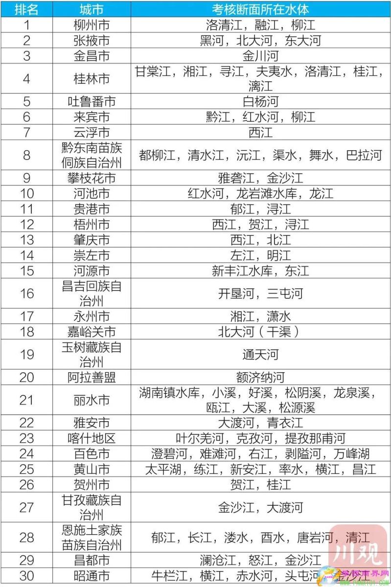 11月19日,生態(tài)環(huán)境部向媒體公布了2020年1-10月全國地表水環(huán)境質(zhì)量狀況。值得關(guān)注的是,在今年1-10月國家地表水考核斷面水環(huán)境質(zhì)量排名前30名城市中,四川有攀枝花、雅安2市入圍,具體名次分別為第9名、第22名。