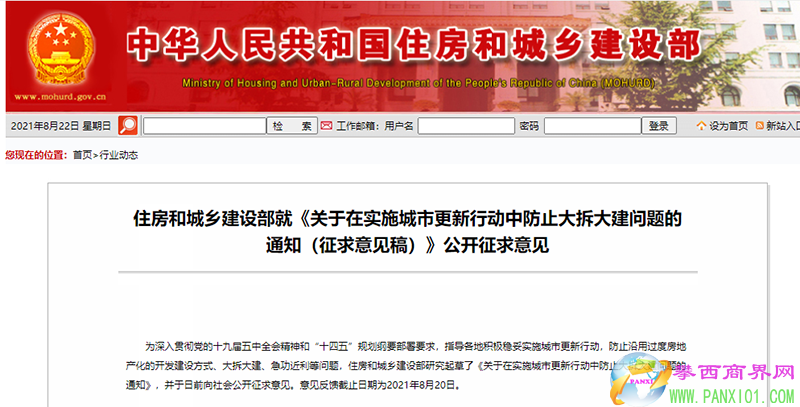 為深入貫徹黨的十九屆五中全會精神和“十四五”規(guī)劃綱要部署要求,指導各地積極穩(wěn)妥實施城市更新行動,防止沿用過度房地產化的開發(fā)建設方式、大拆大建、急功近利等問題,住房和城鄉(xiāng)建設部研究起草了《關于在實施城市更新行動中防止大拆大建問題的通知》,并于日前向社會公開征求意見。意見反饋截止日期為2021年8月20日。