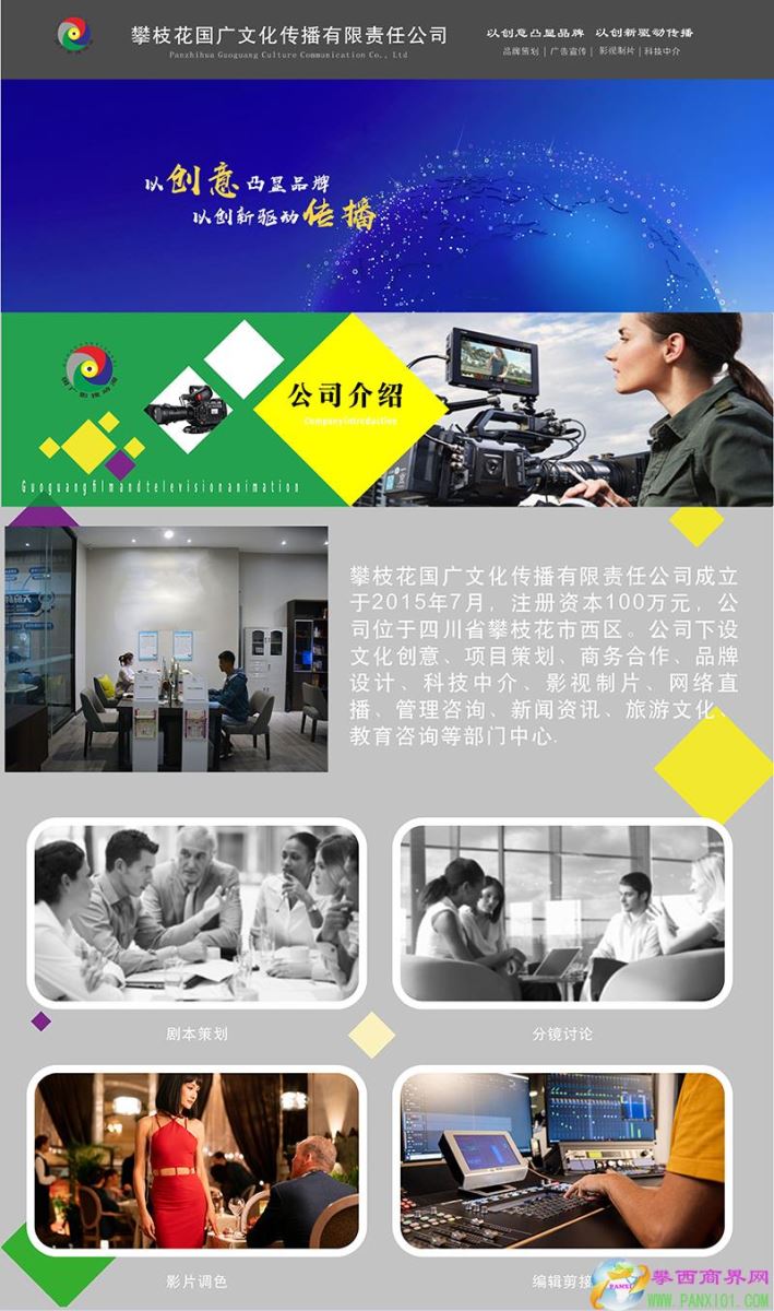 攀枝花國(guó)廣文化傳播有限責(zé)任公司成立于2015年7月,注冊(cè)資本100萬(wàn)元,位于四川省攀枝花市西區(qū)。公司下設(shè)文化創(chuàng)意、項(xiàng)目策劃、商務(wù)合作、品牌設(shè)計(jì)、科技中介、影視制片、網(wǎng)絡(luò)直播、管理咨詢、新聞資訊、旅游文化、教育咨詢等部門中心。