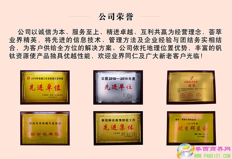 公司依托地理位置優(yōu)勢(shì),豐富的釩鈦資源使產(chǎn)品獨(dú)具優(yōu)越性能,公司以誠(chéng)信為本、服務(wù)至上、精進(jìn)卓越、互利共贏(yíng)為經(jīng)營(yíng)理念,薈萃業(yè)界精英,將先進(jìn)的信息技術(shù)、管理方法及企業(yè)經(jīng)驗(yàn)與團(tuán)結(jié)務(wù)實(shí)相結(jié)合,為企業(yè)供給全方位的解決方案。歡迎業(yè)界同仁及廣大客戶(hù)光臨惠顧!