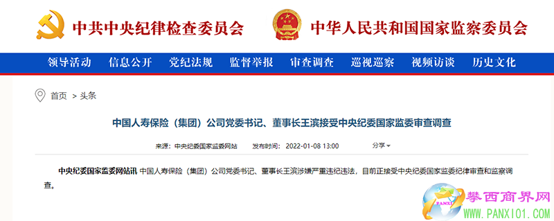 1月8日,中央紀(jì)委國(guó)家監(jiān)委發(fā)布消息,中國(guó)人壽保險(xiǎn)(集團(tuán))公司黨委書(shū)記、董事長(zhǎng)王濱接受審查調(diào)查。