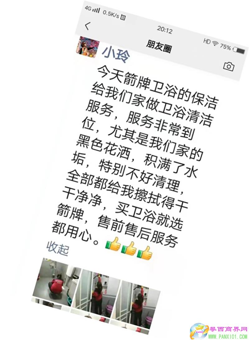 攀西商界網(wǎng)報(bào)道(記者 熊毅)“我們家的黑色花灑積滿了水垢,特別不好清理,箭牌衛(wèi)浴的保潔上門全部給我擦拭得干干凈凈,賣衛(wèi)浴就選箭牌,售前售后服務(wù)都用心!”用戶小玲在微信朋友圈分享了使用箭牌衛(wèi)浴的體驗(yàn)。“品質(zhì)至上,用心服務(wù)”就是箭牌衛(wèi)浴的品牌形象。5月10日,作為箭牌衛(wèi)浴在攀枝花唯一一家總代理攀枝花箭發(fā)建材有限公司同樂(lè)旗艦店盛大開(kāi)業(yè)并在同樂(lè)喜事匯舉行答謝晚宴,受到攀枝花工商界高度關(guān)注。