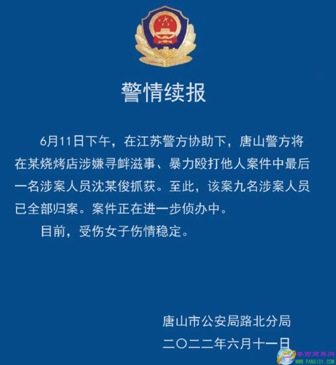 6月11日下午,在江蘇警方協(xié)助下,唐山警方將在某燒烤店涉嫌尋釁滋事、暴力毆打他人案件中最后一名涉案人員沈某俊抓獲。至此,該案9名涉案人員已全部歸案。目前,案件正在進一步偵辦中。據(jù)報道,其中一名主要嫌疑犯陳某志劣跡斑斑,曾多次被限制“高消費”,也即所謂的“老賴”。當(dāng)?shù)貗D聯(lián)回應(yīng)稱,兩名女性已經(jīng)就醫(yī),暫無生命危險。(6月11日中國新聞周刊)