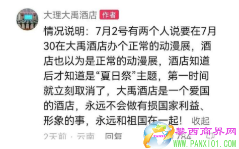 7月23日,云南大理一酒店也發(fā)布情況說(shuō)明:主辦人說(shuō)在大禹酒店舉辦動(dòng)漫展,經(jīng)網(wǎng)絡(luò)曝光后才知道是“夏日祭”主題,第一時(shí)間就立刻取消了,大禹酒店是一個(gè)愛(ài)國(guó)的酒店,永遠(yuǎn)不會(huì)做有損國(guó)家利益、形象的事,永遠(yuǎn)和祖國(guó)在一起!