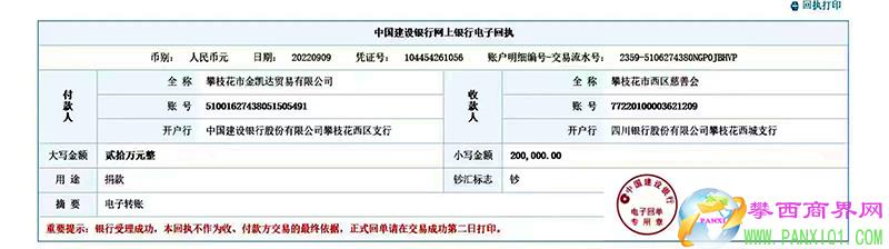 據(jù)了解,這是攀枝花市金凱達貿(mào)易公司剛剛挺過停工復產(chǎn)的陣痛之時,企業(yè)領導層毅然決定為西區(qū)抗疫再出錢再出力,第一時間將20萬元的“抗疫”捐款轉(zhuǎn)入西區(qū)慈善會的專用賬戶里。
