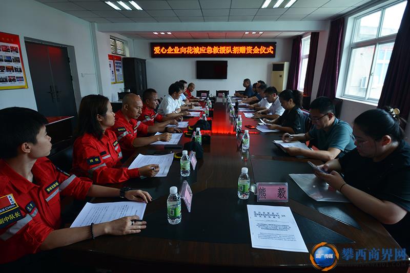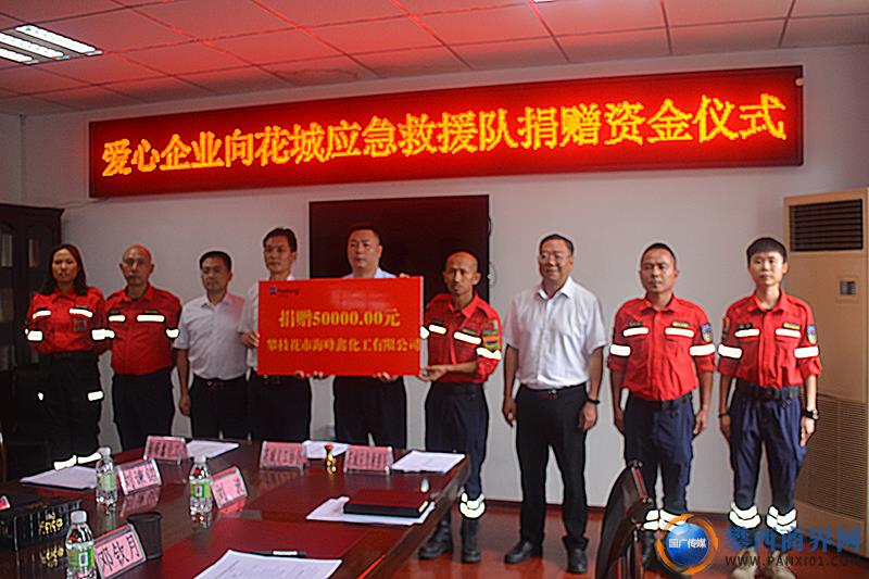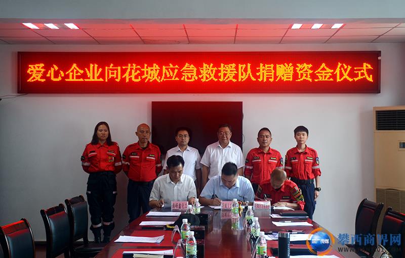 捐贈儀式上,四川礦冶有限公司、攀枝花市海峰鑫化工有限公司代表分別與花城義工協(xié)會、花城應急救援隊負責人簽署捐贈協(xié)議書并舉牌捐贈,花城應急救援隊代表向愛心企業(yè)敬贈了錦旗表示感謝。
