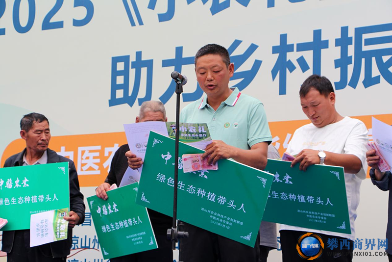 在活動的最后,涼山州農業(yè)科技產業(yè)創(chuàng)新聯(lián)盟中醫(yī)農業(yè)專委會為11戶優(yōu)秀種植戶頒發(fā)了“綠色生態(tài)種植帶頭人”獎牌,并由區(qū)縣服務商帶領優(yōu)秀種植戶們宣讀了《綠色生態(tài)種植保證書》。成都農禮到家農產品有限公司、“小農禮”品牌營運中心負責人殷冬平宣布,今年公司將高于市場價40%-80%優(yōu)價收購祛農殘、祛重金屬、富硒芒果簽約種植戶的芒果?,F(xiàn)場還為11戶優(yōu)秀種植戶每戶發(fā)放了收購定金5000元,這一舉措進一步增強了果農的信心,激勵他們繼續(xù)走綠色生態(tài)種植的道路。