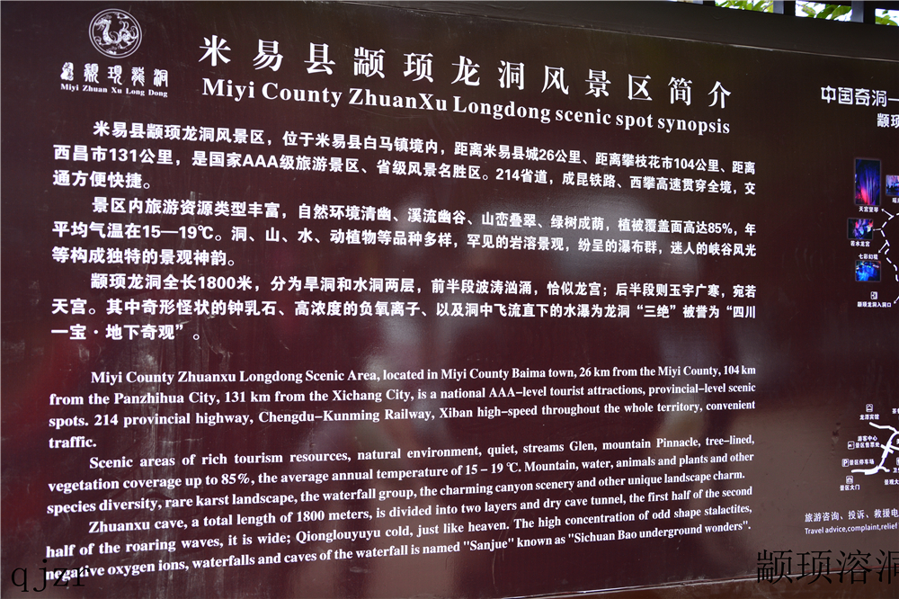 ??? 顓頊龍洞旅游區(qū)屬山河并列的高山峽谷地形,是裂谷裂變褶皺南北延申的中部,方圓面積10平方公里,最高處龍舟山頂海拔2800米,最低安寧河谷海拔1200米,氣候為熱帶和亞熱帶交替的立體型氣候,年均氣溫15-18℃。旅游區(qū)內(nèi)旅游資源類型豐富,自然環(huán)境清幽、山巒疊翠、綠樹成蔭、溪流幽谷,植被覆蓋面高達85%,洞、山、水、動植物等品種多樣,罕見巖溶景觀,紛呈的瀑布群,迷人的裂谷山顛風光等構(gòu)成獨有的景觀神韻,以山體為骨架,以流水為脈絡,以草木為容顏,以特有的藍天、陽光、飛瀑幽峽、奇特溶洞為神采,以獨具的民族宗教史跡、生態(tài)農(nóng)業(yè)和濃厚的鄉(xiāng)村情調(diào)為特色,自然與人文兼?zhèn)?。旅游區(qū)包括顓頊龍洞民俗觀光游覽區(qū),宗教、歷史遺址—掛榜清真寺區(qū),彎丘“五.七干校”,觀音溫泉浴療等四大景區(qū),分布在景區(qū)龍肘山脈中(海拔--1200米至1500米間)與地下伏流伴生且正發(fā)育中的喀斯特巖溶是風景區(qū)最具特色的主景觀,幾乎匯聚了喀斯特巖溶洞穴特征,洞內(nèi)鐘乳石、石柱、石筍、石幔、葡萄石等基本都在發(fā)育中,在現(xiàn)已開發(fā)1760米長的主景觀龍?zhí)抖粗行纬刹粩嘧兓目λ固囟囱ň坝^,獨特的空間構(gòu)成、時隱時現(xiàn)變幻的水景和潔白無暇、晶瑩剔透的鐘乳石等景觀交替呈現(xiàn),景隨水移,水景交融,其中龍宮、天宮和六道洞內(nèi)飛瀑流泉是“三絕”;風景區(qū)除景觀多樣性十分豐富多彩外,負氧離子高更是超越其它國內(nèi)任何游覽洞,游客在觀賞洞內(nèi)美景的同時,又享受負氧離子禮遇,很利于健康長壽。緊臨顓頊龍洞群的23道形態(tài)各異龍?zhí)镀俨既狠o以珍稀植物—桫欏等百余種植物是風景區(qū)一條獨特的風景線;天然林是風景區(qū)的綠色生態(tài)線;與龍?zhí)镀俨既阂凰嘟拥凝堉馍巾斏先f畝杜鵑,綠草如茵,更有生動神秘的傳說;旅游區(qū)北面的四川省“五.七”干校是國內(nèi)保存最完好的干校舊址,黃草櫻桃果業(yè)觀光區(qū)、廟子溝椪柑基地果業(yè)觀光區(qū)體驗全新的鄉(xiāng)村氛圍;南面的觀音溫泉富含各種康浴成份,緊臨214省道,為往旅客洗卻一路塵埃,消除勞頓。旅游區(qū)內(nèi)各景區(qū)間緊緊涵接,互相滲透,景觀相互包容、層次鮮明,對游覽和觀景十分有利。