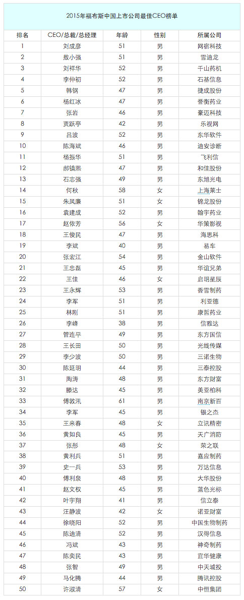 • 2015年中國上市公司最佳CEO排行榜(名單)