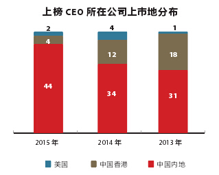 50位上榜CEO所在的公司中,44家在中國上海及深圳交易所上市,4家在香港交易所上市,兩家在美國紐約交易所上市。