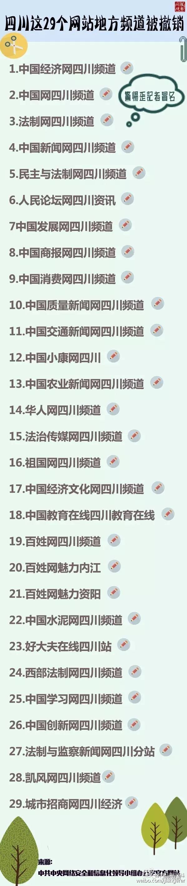 • 【中央網(wǎng)信辦撤銷(xiāo)387家網(wǎng)站地方頻道 29家涉及四川】